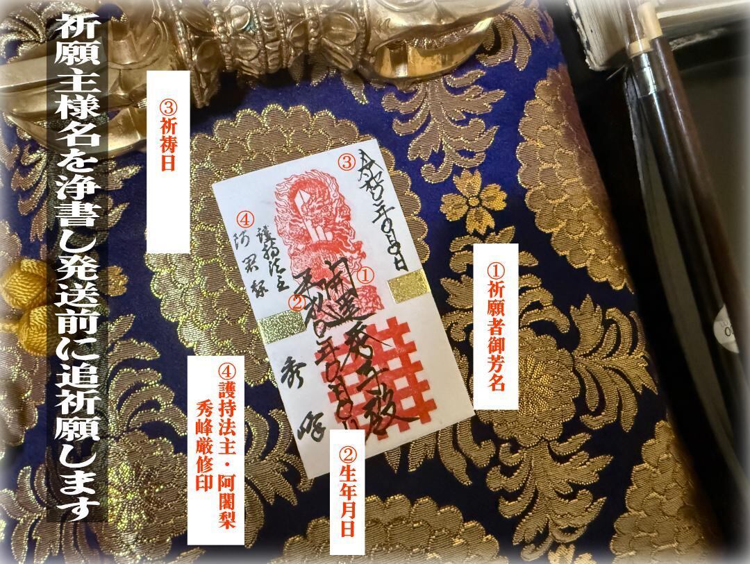 発送前に法主が祈願主様のお名前を浄書し、追祈祷を行います