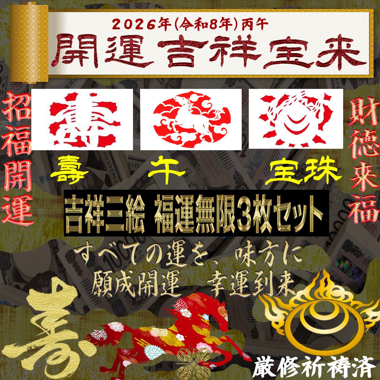 【2026年 令和8年】午・壽・宝珠 宝来 三枚組|大開運・金運上昇・福寿祈願・厄除開運【祈祷済み/弘法大師伝来】