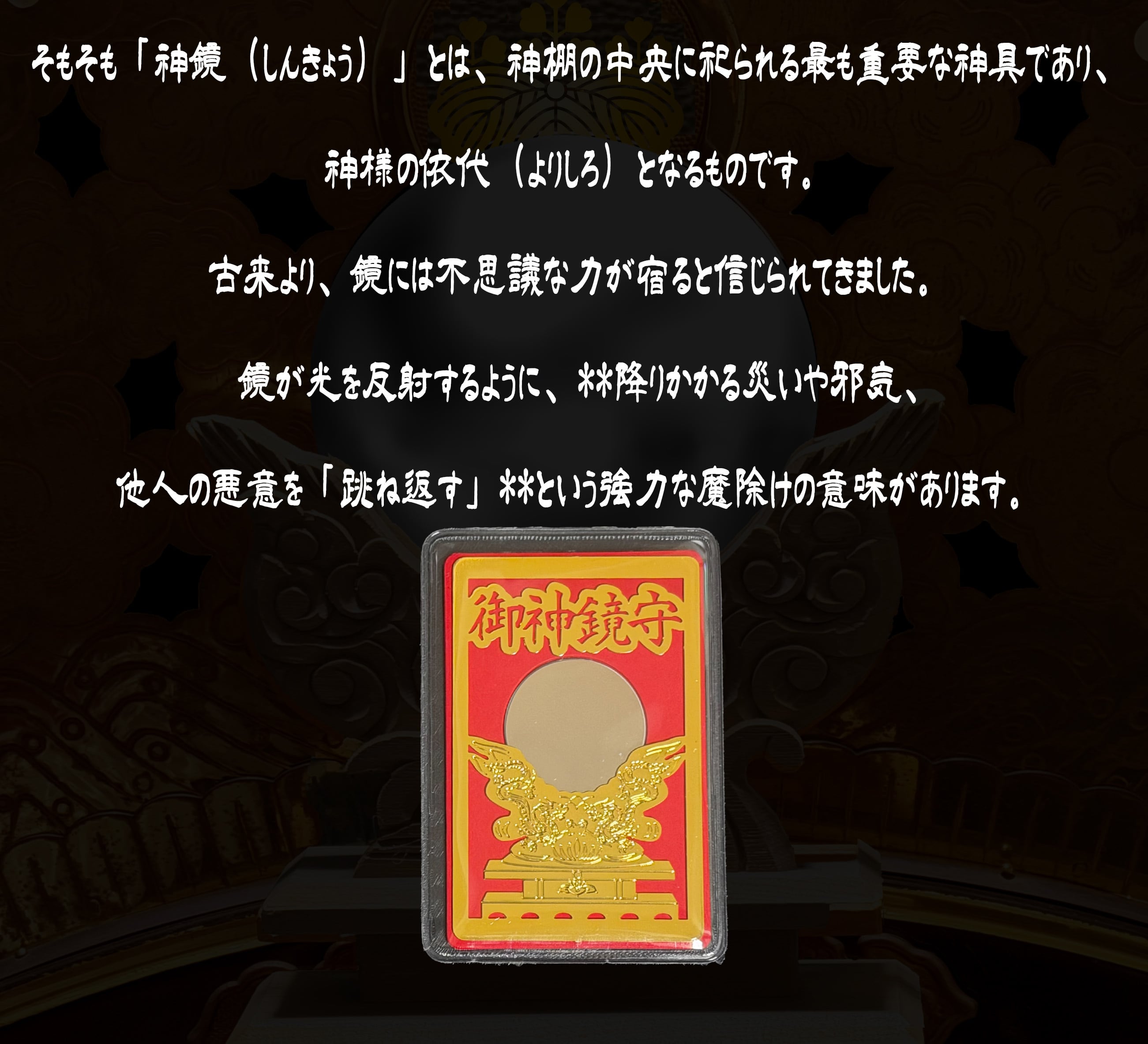 1.邪気を跳ね返す「鉄壁の守り」 神鏡(しんきょう)は、神様の依代(よりしろ)です。鏡が光を反射するように、あなたに降りかかる災い、悪意、邪気、生霊を物理的に「跳ね返す(破邪)」強力な力を持っています。