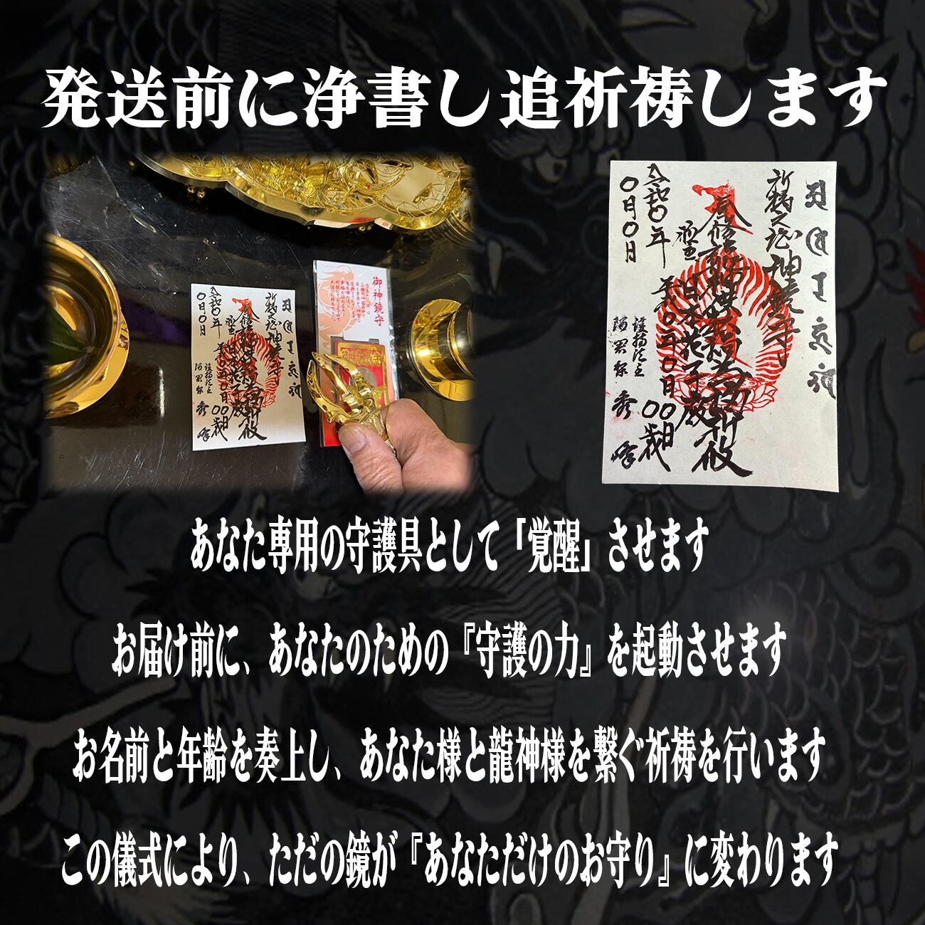 This listing is for the "Dragon God Sacred Mirror Amulet" combined with a "Handwritten Calligraphy (Josho)" by an Esoteric Monk.