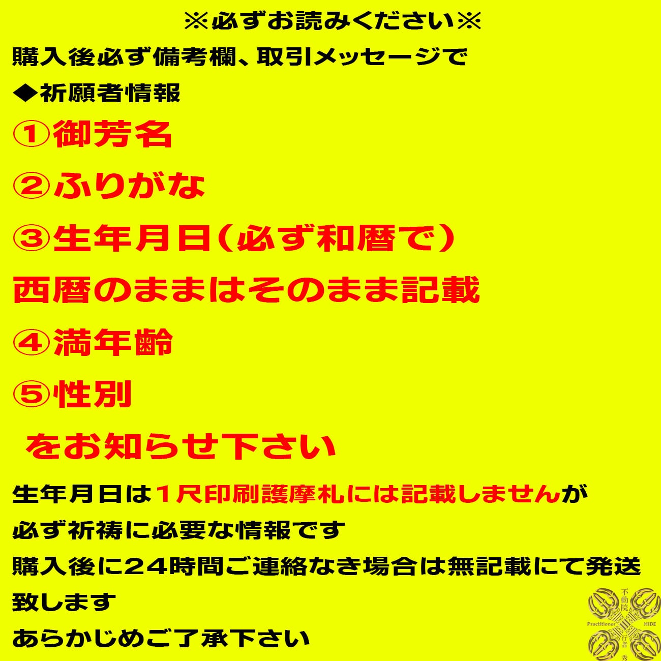 購入後、必ず「備考欄」または「取引メッセージ」にて、**祈願者様全員分(最大6名まで)**の以下情報をお知らせください。